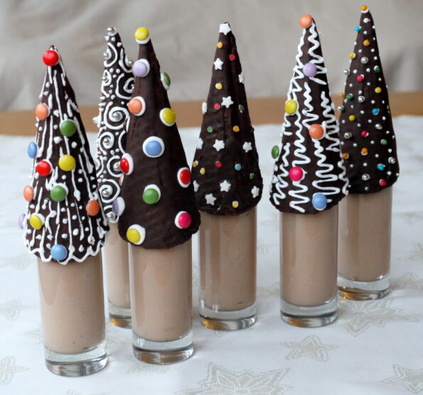 Mlieko povaríme so šľahačkou pri nízkej teplote. Žĺtky vymiešame s cukrom, prilejeme horúce mlieko so šľahačkou. Opäť zohrejeme pri nízkej teplote, pridáme 250 g nalámanej čokolády a miešame, kým sa čokoláda nerozpustí. Nalejeme do malých pohárikov, ktoré majú o niečo menší priemer než kornútky. Odložíme aspoň na 1 hodinu do chladu. Zvyšnú čokoládu rozpustíme vo vodnom kúpeli, kornútky uchopíme pinzetou, namočíme do čokolády a otáčame, kým nie sú z vonkajšej strany celé poliate tmavou polevou (prípadne môžeme čokoládu natrieť na kornútky štetcom). Ozdobíme lentilkami, cukrovými ozdôbkami, bielkovou polevou a pod. Pred servírovaním položíme „vianočné stromčeky“ na naplnené poháre.